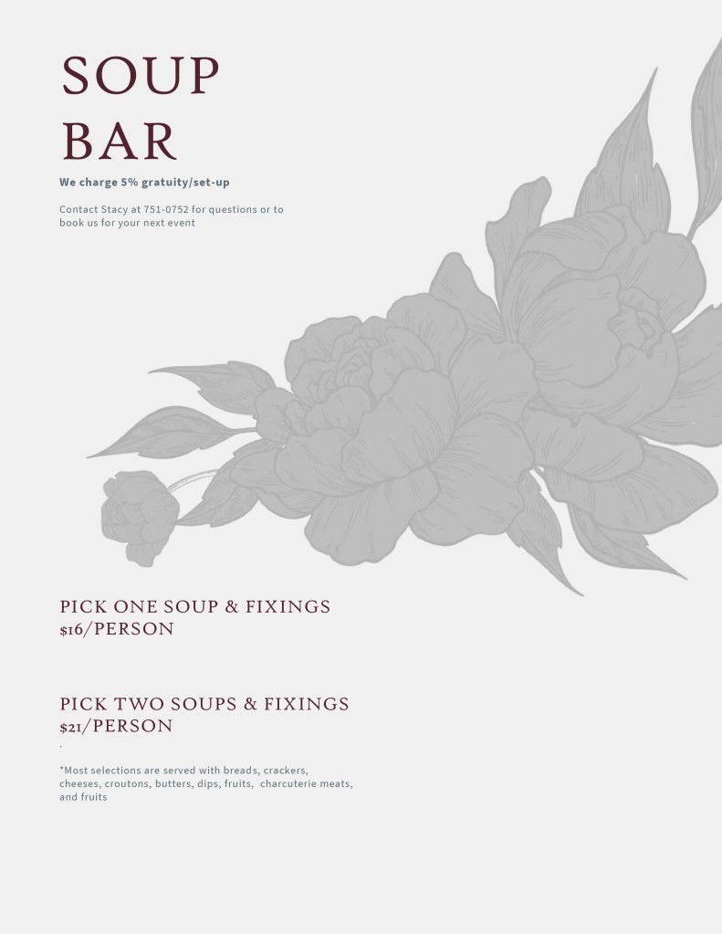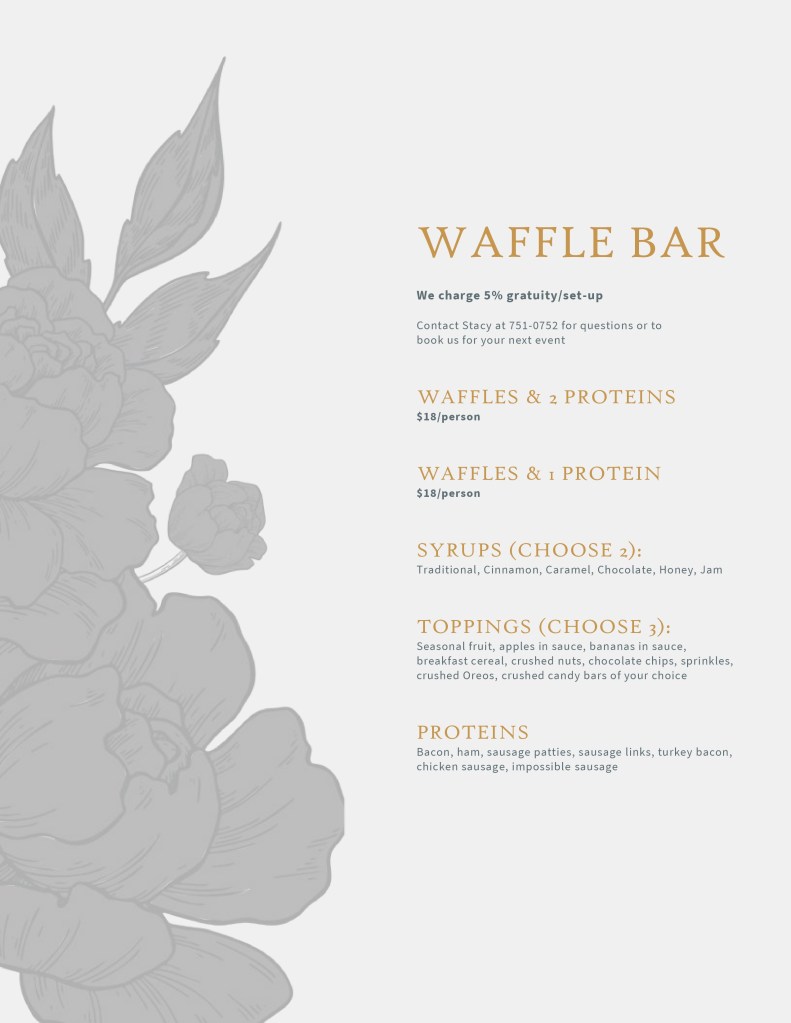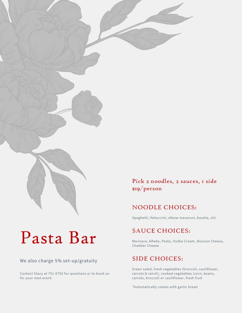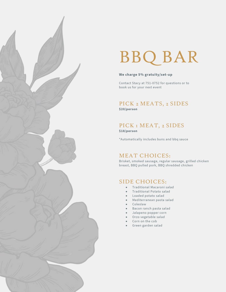 We also have a great menu of brisket, burgers, taco bars, pasta bars, breakfast bars, stuffed chicken breast, beef tips, potato bars, soup boards, charcuterie boards, appetizers and finger foods, and so much more! We give the same care and quality to a party of 200 as we do a party of 20. It’s our goal to create an event everyone will talk about for a long time! Call us about catering your next office party, business event, seminar, birthday party, wedding, anniversary, graduation, etc.