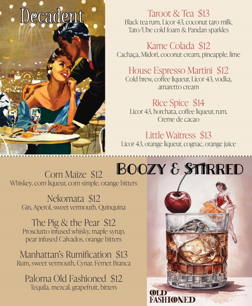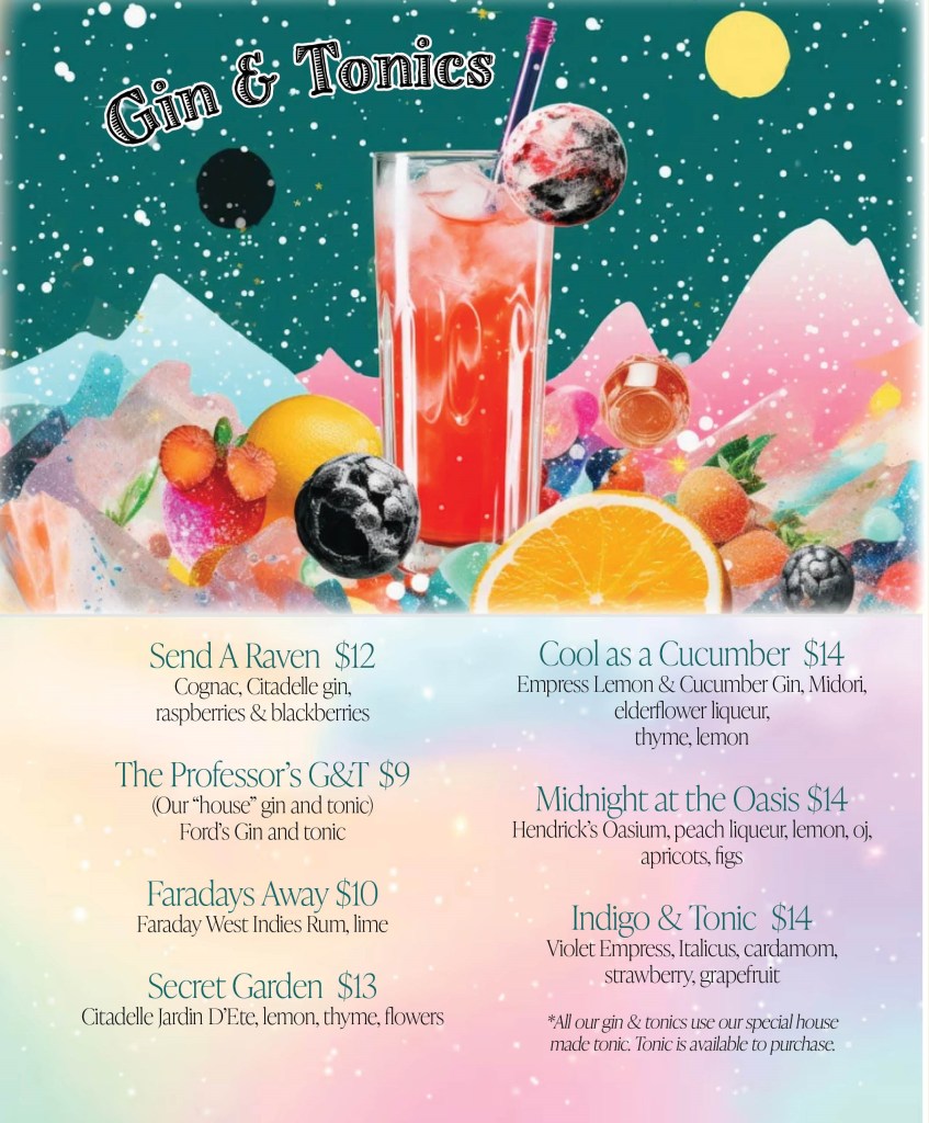 Our new menu is out!!!! We have numerous signature cocktails, classic cocktails, mocktails, gin and tonics, beers, wines, and food. We’re very proud of the quality of this menu. Some of our regulars have said it’s our best and most fun menu yet! Please come in and give it a try. We’re open Tuesday through Thursday 5 to 10 p.m. and Friday and Saturday 5 to Midnight. Here is our menu: